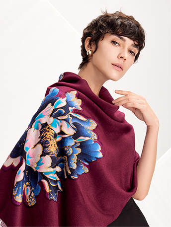 作品以牡丹花為紋樣,加以漳絨剪花的工藝和純手工縫珠繡法,精致的點綴了蠶絲厚織圍巾。搭配各種服飾都能凸顯優雅與沉穩氣質,在秋冬給人以溫暖之感。